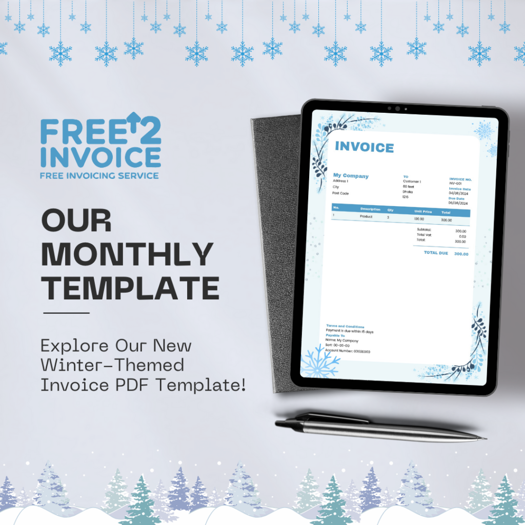 Welcome to Free 2 Invoice.Here we provide free invoice services with no hidden charges. We upload a special template each month. We are happy to let you know that for January 2025 we have published a Winter Themed Template. Check It Out